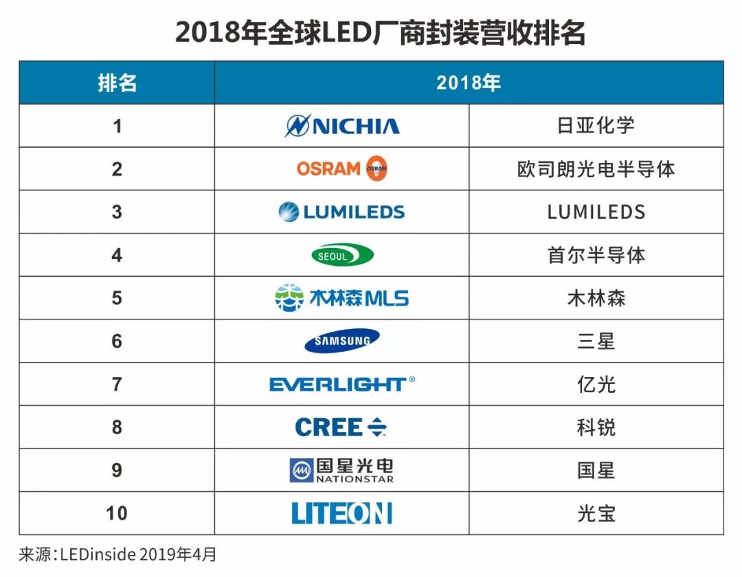 近日,据LEDinside产业供需数据库数据显示,2018年LED封装产值达到184亿美元。并发表了2018年全球LED厂商封装营收排名,木林森全球排名第5位。